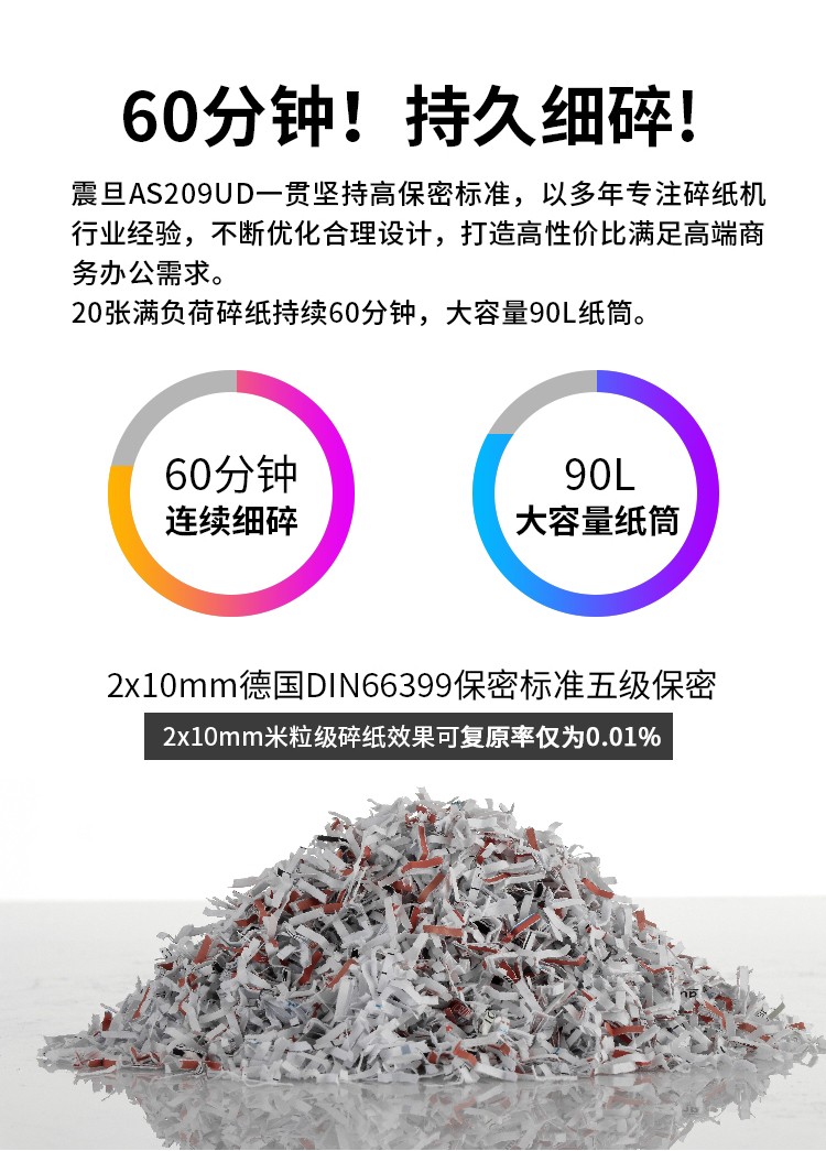 震旦(AURORA)AS209UD 5级商用高保密 碎纸机 (单次可碎20张 连续碎纸60分钟)